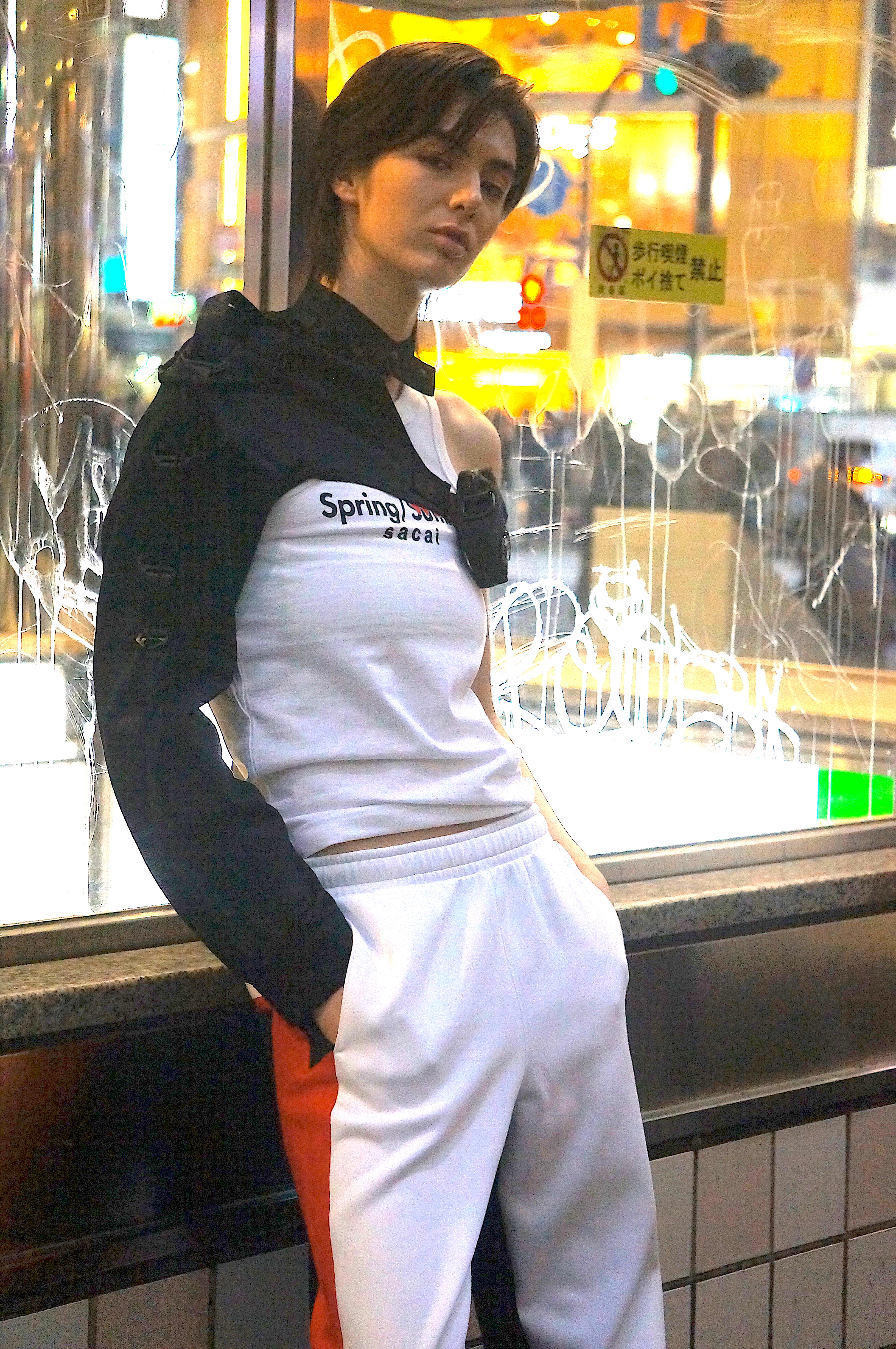 Image 3 & 4: Top by Sacai @sacaiofficial, track pants by Ader Error X Puma @ader_error, Shoulder piece with cigarette bag by Hyein Seo @hyeinantwerp,